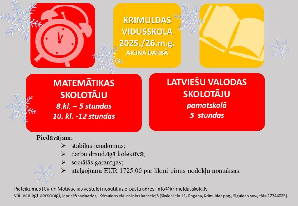 Dalīties Krimuldas vidusskola, reģistrācijas Nr.4313901119, ar 2026. gada 5. janvāri uz noteiktu laiku aicina darbā matemātikas skolotāju 8.klasei (5 kontaktstundas) un Matemātikas I skolotāju 10. klasei (12 kontaktstundas), profesijas klasifikatora kods 233001) uz noteiktu laiku, Prasības: Izglītības atbilstība un profesionālā pilnveide atbilstoši 11.09.2018. Ministru kabineta noteikumu Nr.569 “Noteikumi par pedagogiem nepieciešamo izglītību un profesionālo kvalifikāciju un pedagogu profesionālās kompetences pilnveides kārtību” prasībām; labas komunikācijas prasmes ar bērniem, vecākiem un kolēģiem; iniciatīva un patstāvība, pildot darba pienākumus. Pienākumi: īstenot vispārējās pamatizglītības un vispārējās vidējās izglītības programmu matemātikā, atbilstoši Valsts izglītības standartam; kārtot dokumentāciju atbilstoši izglītības iestādes noteiktajām prasībām; nodrošināt kvalitatīvu izglītošanās procesu; veikt izglītojamo attīstības dinamikas izpēti un sava darba pašanalīzi; veidot pozitīvu saskarsmi ar izglītojamajiem, vecākiem, skolas pedagogiem un darbiniekiem; piedalīties iestādes aktivitātēs un pasākumos; valsts valodas prasme augstākajā līmenī. Piedāvājam: stabilus ienākumus; darbu draudzīgā kolektīvā; sociālās garantijas; veselības apdrošināšanas polisi pēc nostrādātiem trīs mēnešiem; atalgojumu EUR 1725,00 par likmi pirms nodokļu nomaksas; Krimuldas vidusskola, reģistrācijas Nr.4313901119, ar 2026. gada 5. janvāri aicina darbā latviešu valodas skolotāju pamatskolā (5 kontaktstundas), profesijas klasifikatora kods 234101) uz noteiktu laiku, Prasības: Izglītības atbilstība un profesionālā pilnveide atbilstoši 11.09.2018. Ministru kabineta noteikumu Nr.569 “Noteikumi par pedagogiem nepieciešamo izglītību un profesionālo kvalifikāciju un pedagogu profesionālās kompetences pilnveides kārtību” prasībām; labas komunikācijas prasmes ar bērniem, vecākiem un kolēģiem; iniciatīva un patstāvība, pildot darba pienākumus. Pienākumi: īstenot vispārējās pamatizglītības programmu latviešu valodā, atbilstoši Valsts izglītības standartam; kārtot dokumentāciju atbilstoši izglītības iestādes noteiktajām prasībām; nodrošināt kvalitatīvu izglītošanās procesu; veikt izglītojamo attīstības dinamikas izpēti un sava darba pašanalīzi; veidot pozitīvu saskarsmi ar izglītojamajiem, vecākiem, skolas pedagogiem un darbiniekiem; piedalīties iestādes aktivitātēs un pasākumos; valsts valodas prasme augstākajā līmenī. Piedāvājam: stabilus ienākumus; darbu draudzīgā kolektīvā; sociālās garantijas; veselības apdrošināšanas polisi pēc nostrādātiem trīs mēnešiem; atalgojumu EUR 1725,00 par likmi pirms nodokļu nomaksas; Pieteikšanās termiņš un kārtība: Pieteikumus (CV un Motivācijas vēstule) nosūtīt uz e-pasta adresi info@krimuldasskola.lv vai iesniegt personīgi, iepriekš pierakstoties, Krimuldas vidusskolas kancelejā (Skolas iela 11, Ragana, Krimuldas pagasts, Siguldas novads, tālr. 27744035) Datu pārzinis ir Siguldas novada pašvaldība, reģistrācijas numurs 90000048152, juridiskā adrese Pils ielā 16, Siguldā, Siguldas novadā, kas veic personas datu apstrādi darbinieku atlasei. Papildu informāciju par minēto personas datu apstrādi var iegūt Siguldas novada pašvaldības tīmekļa vietnes www.sigulda.lv sadaļā Pašvaldība/Privātuma politika, iepazīstoties ar Siguldas novada pašvaldības iekšējiem noteikumiem “Par Siguldas novada pašvaldības personas datu apstrādes privātuma politiku” vai klātienē Siguldas novada pašvaldības klientu apkalpošanas vietās.